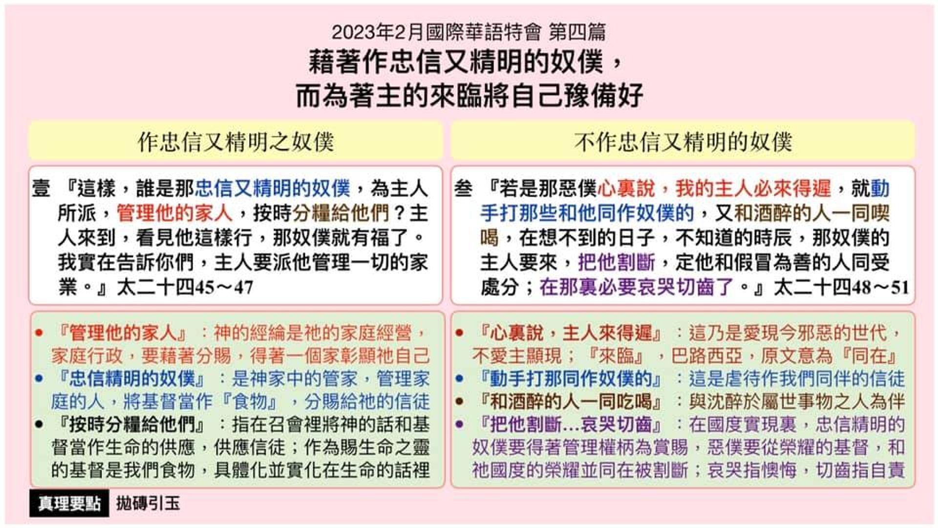 贰 不忠愚拙的恶仆 :①爱现今邪恶世代②虐待同作奴仆者 ③与酒醉者同喫喝④无分国度的实现
