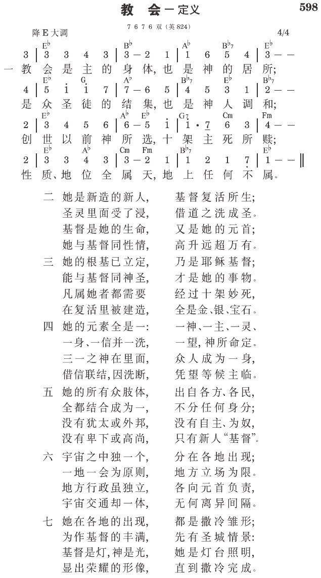 所有的地方召会,乃是基督在宇宙中独一的身体(弗四4)。每一个地方召会,都是这宇宙身体的一部分,是这独一身体在地方上的显出。这一个宇宙召会,这一个身体,包括所有的地方召会。可能有成千上万的地方召会,但合在一起却构成一个宇宙召会。宇宙召会是基督独一的身体,所有的地方召会不过是这一个身体在地方上的彰显。(新约总论第七册,一一一至一一二、一一五、一二三至一二五、一二八至一三一页。)